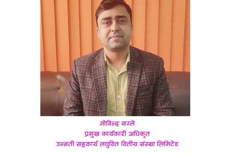 २०७० सालमा स्थापना भएको उन्नती सहकार्य लघुवित्त वित्तीय संस्था लिमिटेड रुपन्देहीको भैरहवामा प्रधान कार्यालय भएको राष्ट्रियस्तरको लघुवित्त वित्तीय संस्था हो । २०ंं७७ सालमा रुपन्देहीको भैरहवामा प्रधान कार्यालय भएको उन्नतीर सर्लाहीको हरिबनमा प्रधान कार्यालय भएको सहकार्य लघुवित्त वित्तीय संस्था सँग मर्ज भएर बनेको उन्नती सहकार्यको हाल चुक्तापुँजी २४ करोड ६८ लाख रुपैयाँ रहेको छ । कूल तीन अर्ब ८३ करोड रुपैयाँ कर्जा लगानी गरेको संस्थाले एक अर्ब २१ करोड रुपैयाँ निक्षेप संकलन गरेको छ । करिब ७० हजार ग्राहकलाई सेवा दिइरहेको संस्थामा हाल ३३ हजार जना कर्जाग्राही छन् भने ८२ वटा शाखा कार्यालयमा दुई सय ४५ भन्दा बढी कर्मचारीहरुले प्रत्यक्ष रोजगार पाएका छन् । २०८१ चैत्र २८ गते देखि संस्थाको प्रमुख कार्यकारी अधिकृतको भूमिकामा रहनु भएका युवा सिईओ गोविन्द वाग्ले सँग देशको अर्थतन्त्र र वित्तीय क्षेत्रको वर्तमान अवस्थामा आधारित भई दैनिक लुम्बिनीका लागि पोसकान्त पोखरेलले गरेको कुराकानीको संक्षिप्त सम्पादित अंश :