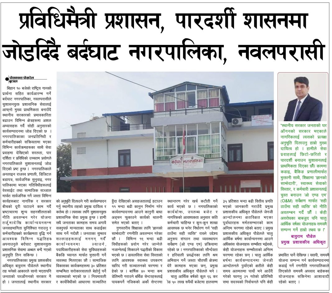बुटवल । बिहान १० बजेको राष्ट्रिय गानको प्रार्थना सहित कार्यआरम्भ गर्ने बर्दघाट नगरपालिका, नवलपरासीले सुशासनयुक्त प्रशासनिक सेवालाई आफ्नो मुख्य प्राथमिकता बनाउँदै स्थानीय सरकारको प्रभावकारिता बढाउन विभिन्न क्षेत्रहरुमा अशल अभ्यासहरु गर्दै सोही अनुसारको कार्यसम्पादनमा जोड दिएको छ । नगरपालिकाका जनप्रतिनिधी र कर्मचारीहरूको सक्रियतामा भएका विभिन्न कार्यक्रमहरुका साथै सेवा प्रवाहमा देखिएको सरलता, पारदर्शिता र प्रविधिको उच्चतम प्रयोगले नगरपालिकाले सुशासनलाई जोड दिएको प्रष्ट हुन्छ । नगरपालिकाले अनलाइन राजस्व प्रणाली, डिजिटल बडापत्र, सार्वजनिक सुनुवाइ, नगरपालिकामा भएका गतिविधीहरुलाई वेवसाईट तथा सामाजिक सञ्जाल मार्फत सार्वजनिक गर्ने जस्ता विभिन्न कार्यहरुबाट नागरिक र सरकारबीचको दूरी घटाउने काम गर्दै भ्रष्टाचारमा शून्य सहनशीलताको नीति अवलम्बन गरेर योजना तर्जुमादेखि कार्यान्वयनसम्म जनसहभागिता सुनिश्चित गराउनु र कर्मचारीहरूको कार्यक्षमता वृद्धि गर्न आवश्यक विभिन्न पद्धतिहरू अपनाउनुले बर्दघाट सुशासनयुक्त प्रशासनिक सेवामा अब्बल बन्दै गएको अनुभूति लिन सकिन्छ ।